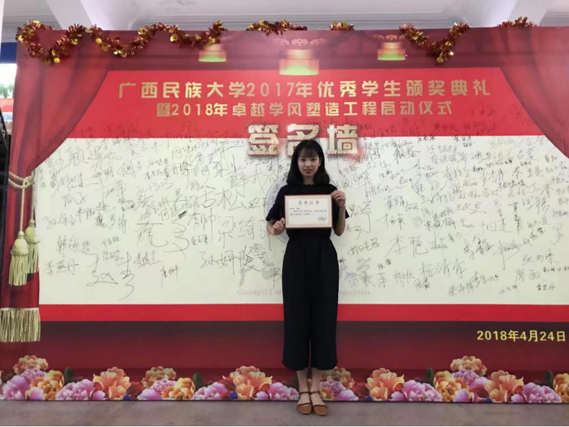 凌倩相信学无止境,她在学习中充实自我,并力图在不一样的领域发展不一样的自己。入校以来,她多次获得“国家励志奖学金”、校级奖学金;积极参加“全国大学生英语竞赛”、“广西民族大学民族团结知识竞赛”,还经常参加科技、人文、艺术等方面的讲座,这一切不仅让凌倩拓展了知识面,还提高了综合素质能力。