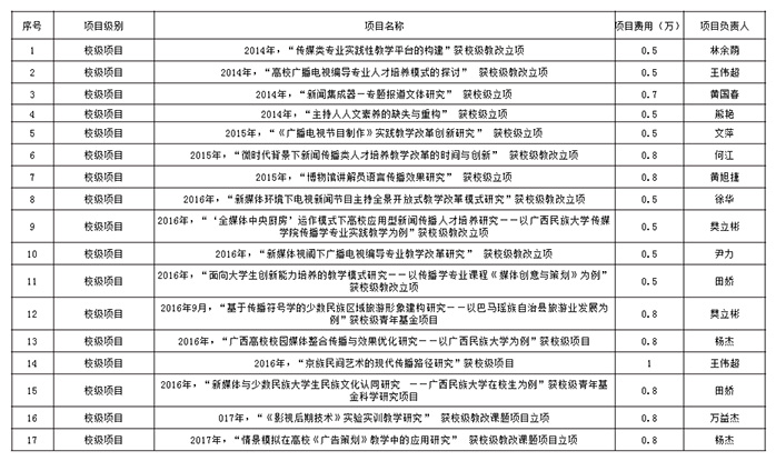 获得国家级项目1项,省部级项目3项,地厅级项目9项,校级项目17项,与广西防城港市委宣传部形成横向合作——“防城港城市形象传播策略研究”立项,获资助经费10万,共获得经费资助52.8万元左右。此外,“部校共建”自2017年起,自治区党委宣传部、广西电视台、广西民族大学共建传媒学院,每年资助经费150万,连续共建5年。